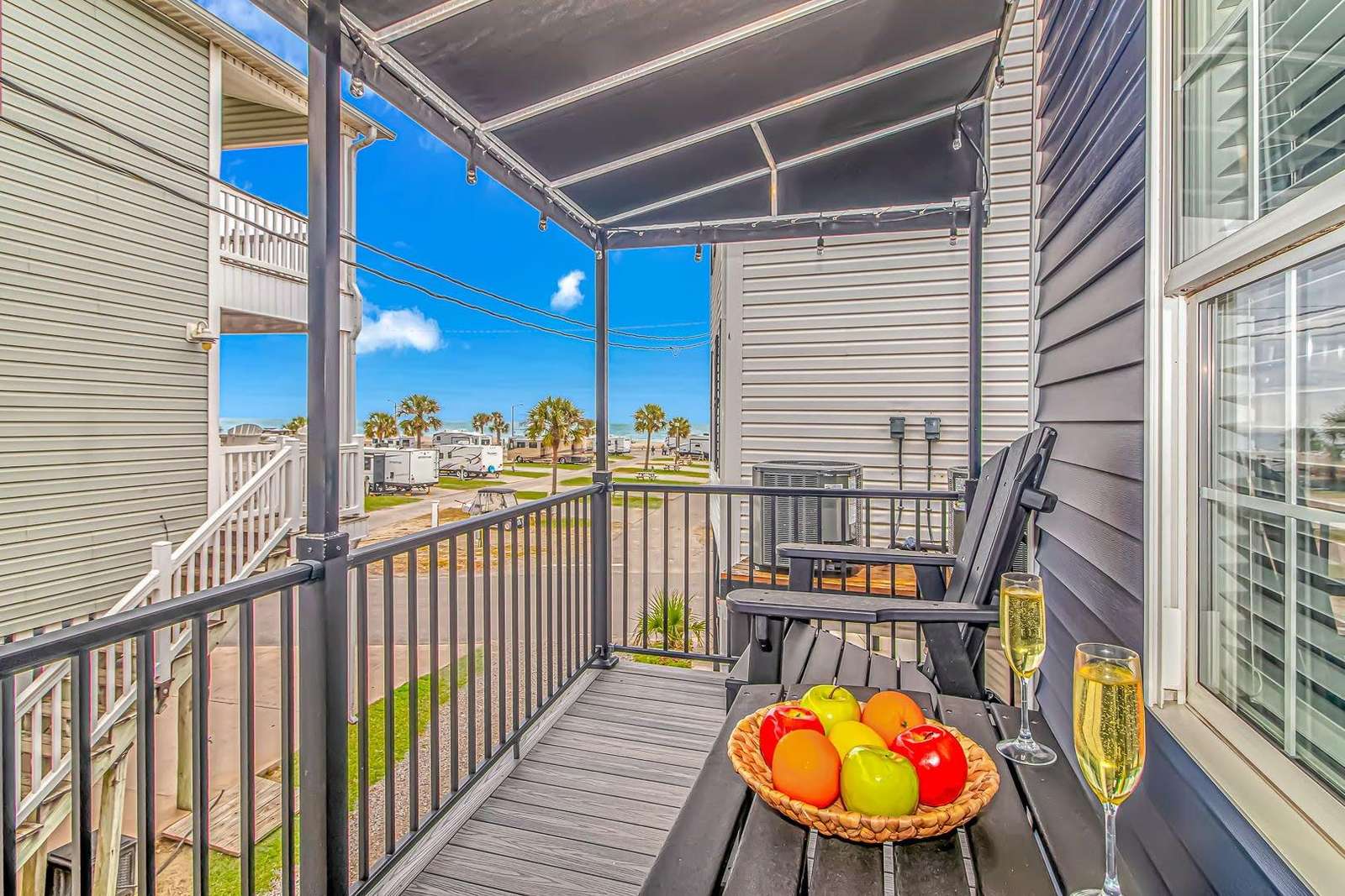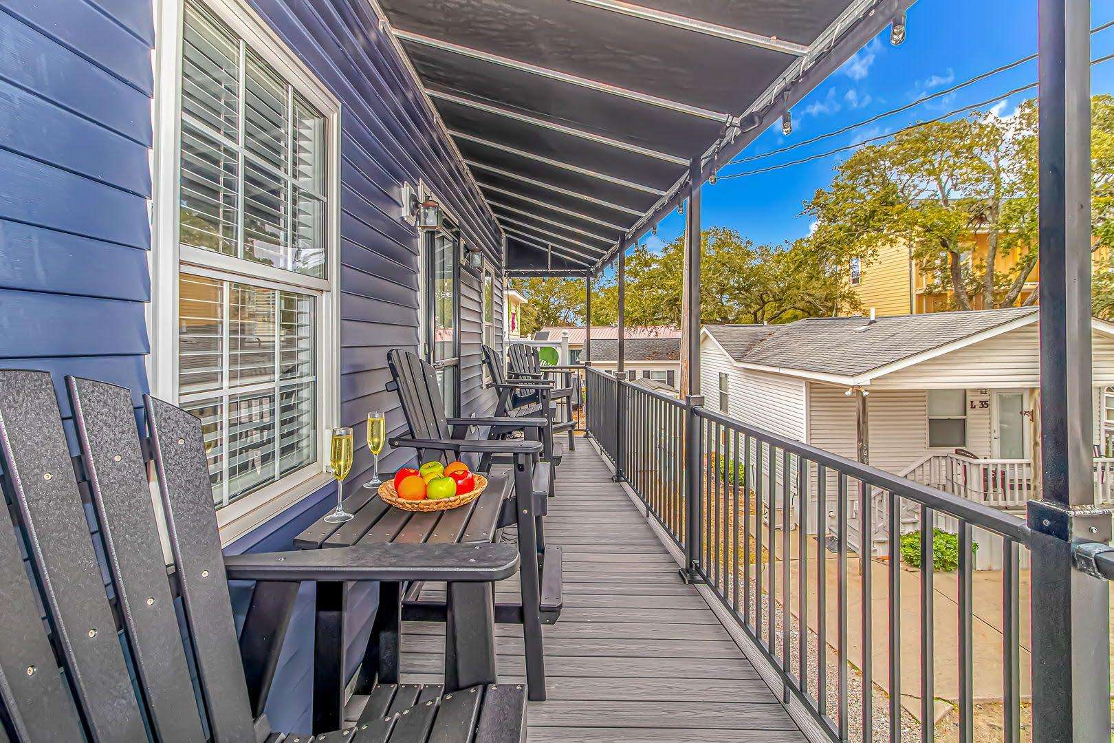 This stilted beach house features view of the ocean from its second-floor canopied deck. The open floor plan includes living room, updated kitchen with dishwasher, full-sized washer and dryer, hardwood floors throughout, and enough bedding to accommodate 8 guests comfortably. There are 3 spacious bedrooms inside the home, including one with an ocean view itself, from the bed, and another with a water park view.