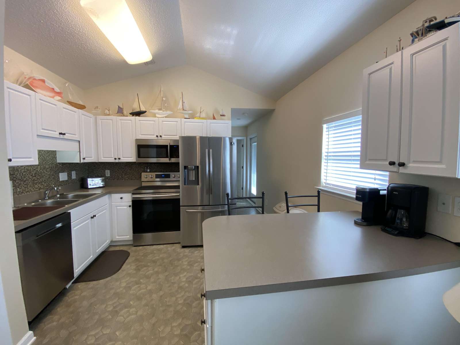 A family getaway in Ocean Lakes Family Campground with beachside fun! This 3-bedroom, 3-bath home offers room for everyone to make memories. The kitchen is equipped with a full-size refrigerator, dishwasher, stove, oven, microwave, and cookware. A large dining table facilitates family meals. A laundry closet with washer and dryer is included. A complimentary golf cart is provided for campground exploration, and small dogs (25 pounds or less) are welcome with a $200 non-refundable pet fee.